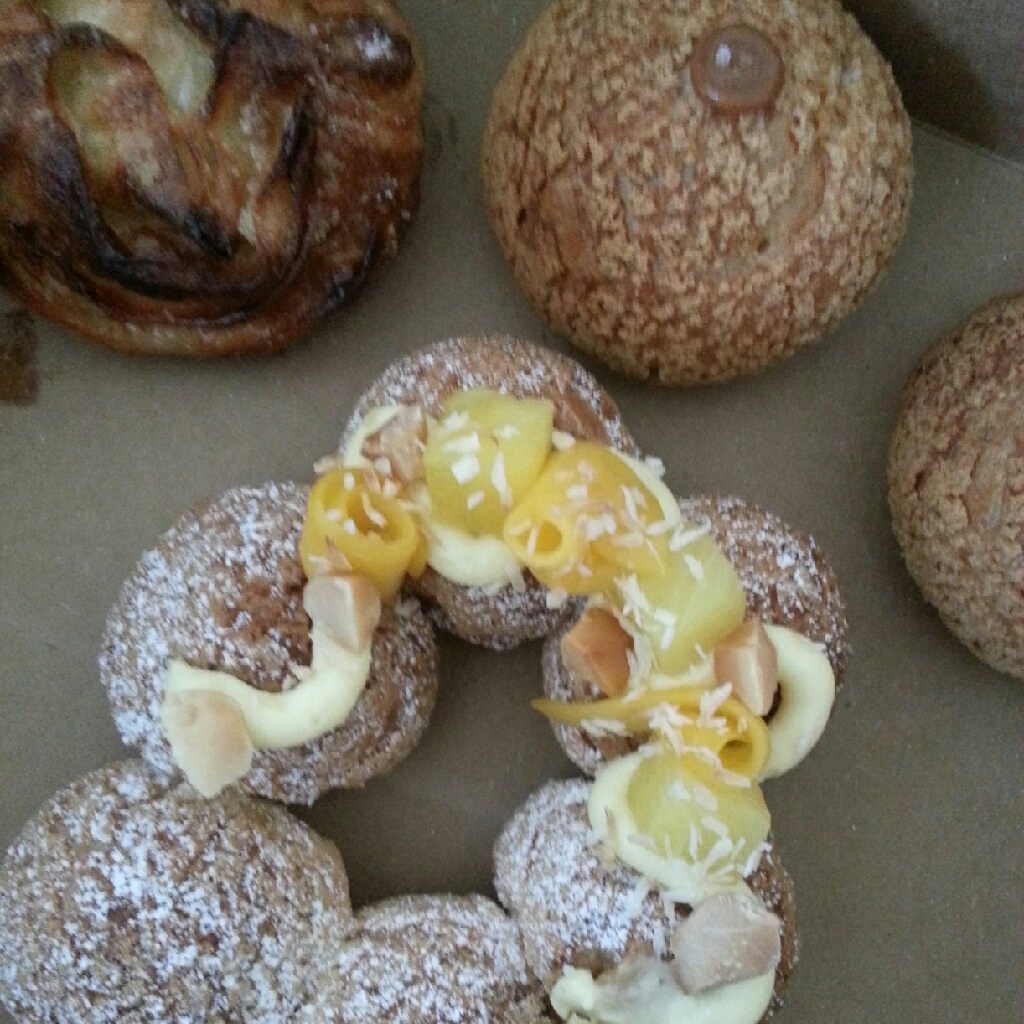 First, the creampuffs: perfectly baked choux puffs, filled to order with creams and custards ranging from vanilla to salted caramel, creamsicle and pistachio. They also do sweet rings, which are rings of 6 choux puffs filled with your choice of custards. When I stopped in on Sunday, they were doing a special tropical ring, filled alternately with vanilla and coconut custards, and topped with pickled pineapple, mangos, and crushed macadamias.