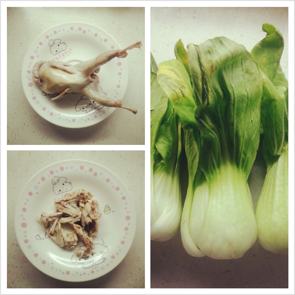 [clockwise: boiled quail, bok choy, pressure-cooked quail bones]