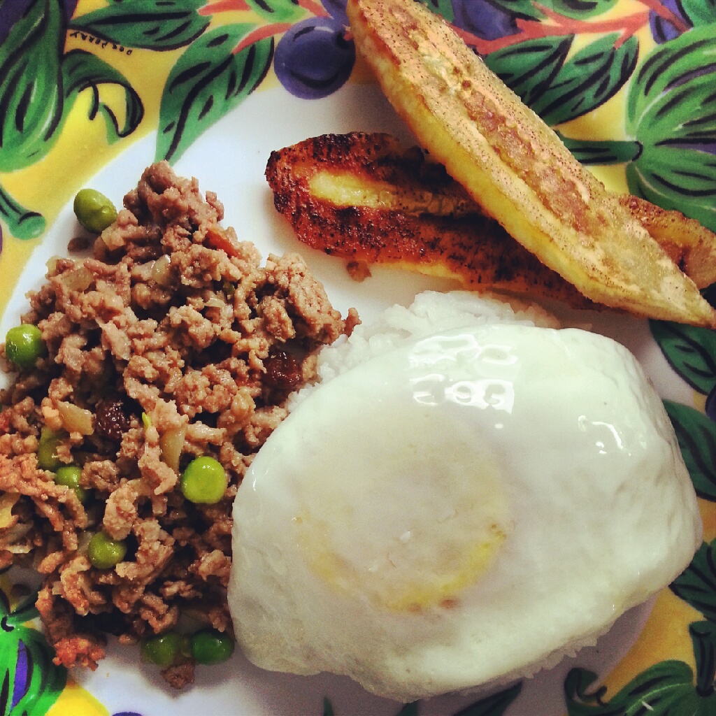 Arroz a la cubana is basically a combination of ground beef and pork sautéed with onions, garlic, peas, raisins,and tomatos, served alongside steamed rice, a fried egg, and plantains. I love the sweetness of the plantains, caramelized and crunchy along the edges, with the lightly salty meat and runny, bright yellow yolks. It’s a meal I’ll stay in for.