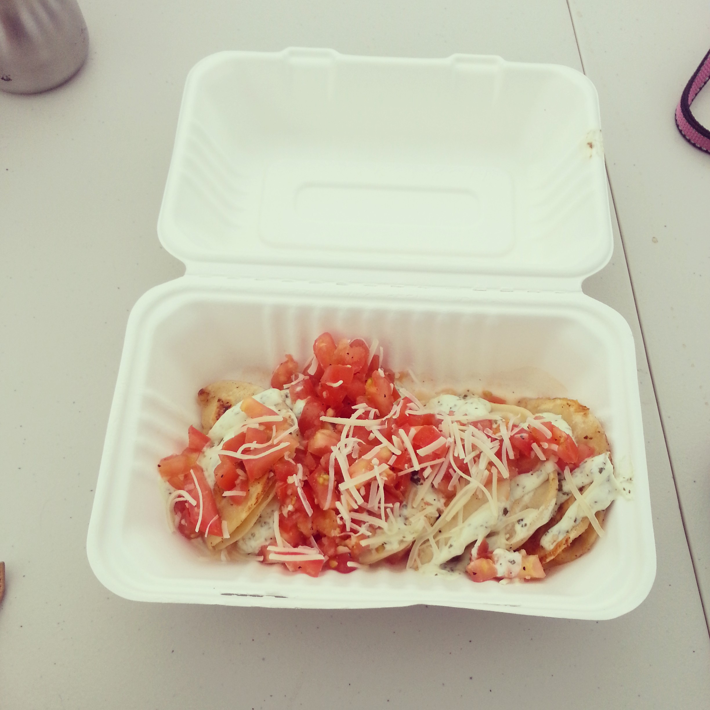 This past Sunday, I went to Vancouver’s Food Cart Fest with my family and some friends. It was a little drizzly and chaotic (parking was nearly impossible because it was also Dragon Boat weekend), but we finally got in and began to check out each cart’s menu. There was a good variety of carts, from grilled cheese at Taser’s to chicken & waffles at Yolk’s, crazy hot dogs at Dougie’s and crepes at Ze Bite. I’ll be honest though, it was a little disappointing because the food trucks my mom and I were most excited about, namely Le Tigre, The Reef Runner, and Guanaco, were not there that day (the event is running every Sunday until September 22nd). We were seriously craving some beet fries and braised pork belly, jerk chicken, and pupusas, but we were happy enough with the oyster po’boy (Kaboom Box) and perogies (Holy Perogy) we had instead. We chose the “Italian perogies”, which instead of the typical caramelized onions and sour cream topping, had tomatos, parmesan (or pecorino?), and a garlic cream sauce. Perogies aren’t something I would typically get from a food truck, but Stella was getting antsy, and it turned out to be a not-so-bad choice.