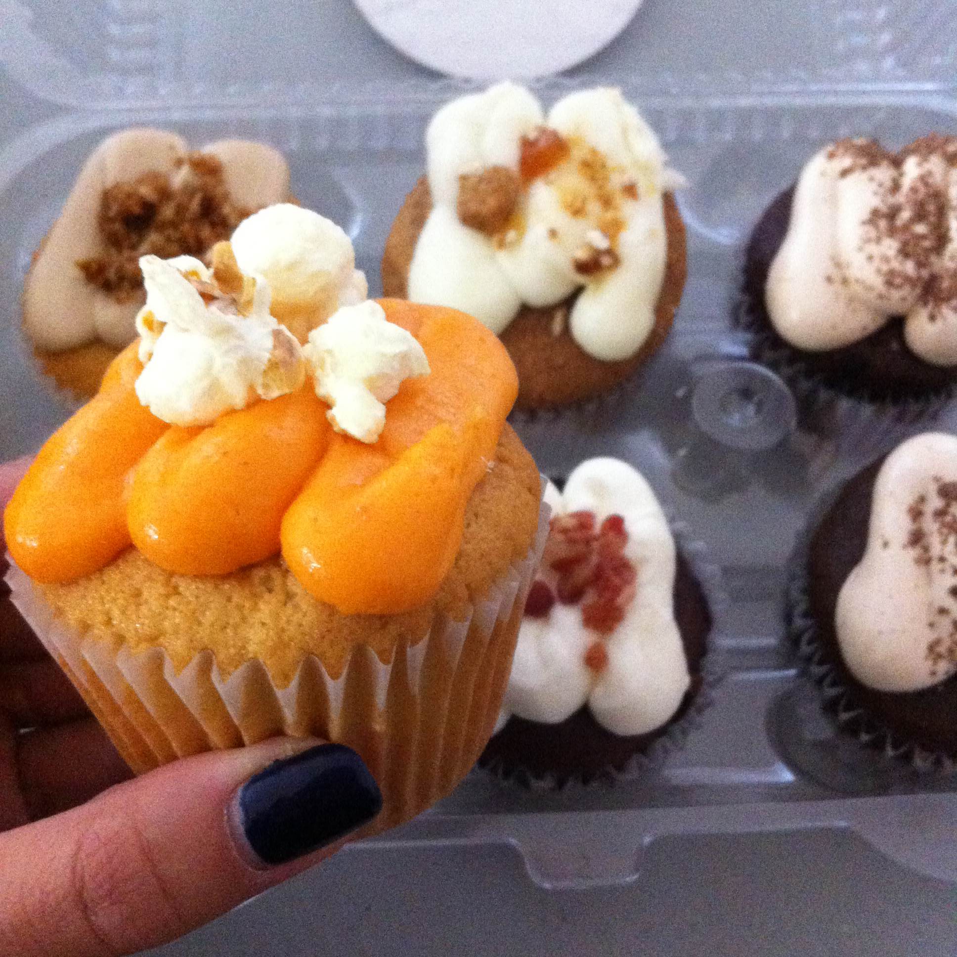The first cupcake that caught my eye was one called “Chicago”, topped with bright orange frosting and popcorn, and as I suspected, it was their take on the Garrett’s Popcorn “Chicago Mix” – cheddar and caramel popcorn. I obviously had to try that one, along with King Kong (chocolate + banana cream + espresso frosting), Apple Brie, Bacon Chili Chocolate, and Breakfast (vanilla + bacon & egg custard + maple syrup frosting). Chicago was definitely the winner, with Breakfast and King Kong tied for second.